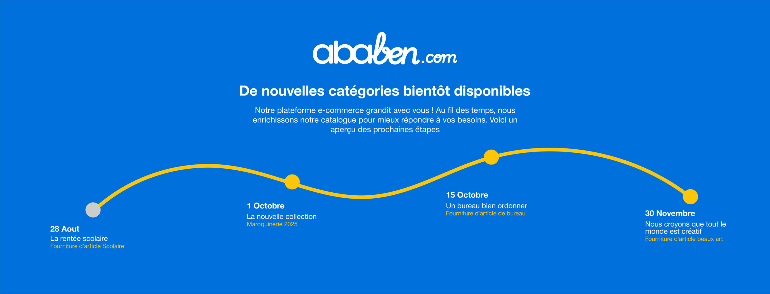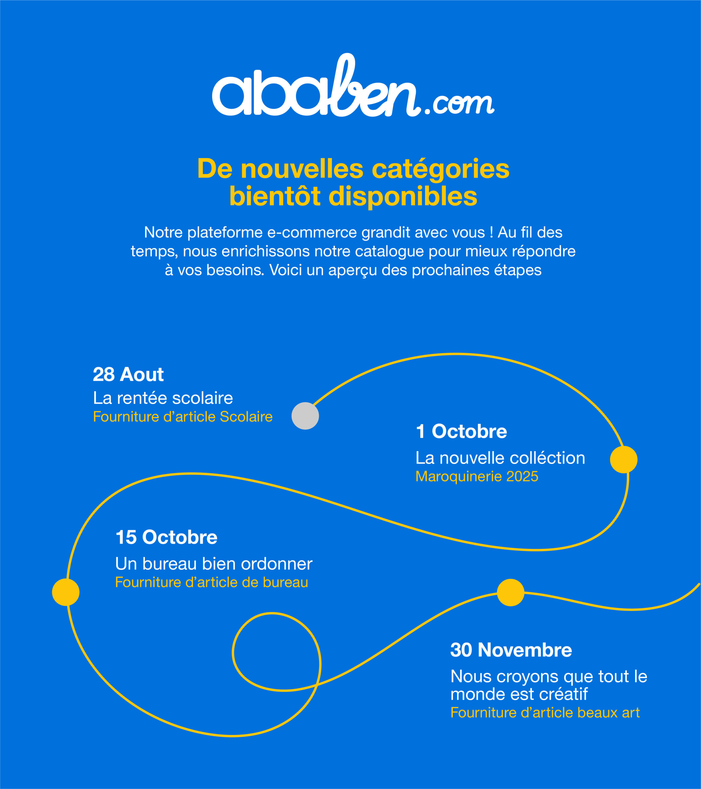 ababen propose une sélection rigoureuse de produits pensés pour répondre aux besoins essentiels à chaque étape de la vie. Que ce soit pour accompagner la scolarité, encourager la créativité, faciliter l’organisation ou offrir des solutions pratiques au quotidien, nous mettons en avant des articles alliant qualité, utilité et durabilité. Chaque produit est choisi avec soin pour garantir une expérience satisfaisante, en phase avec les attentes et les exigences de nos clients.
