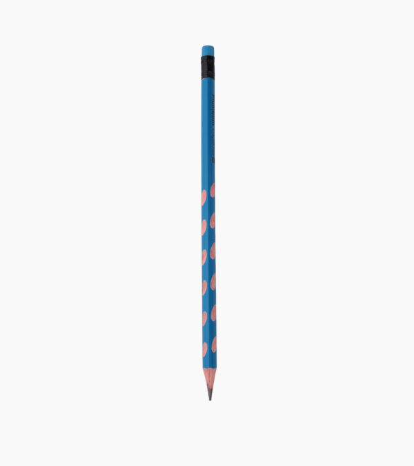 Crayon graphite HB avec gomme intégrée et design ludique à pois colorés.