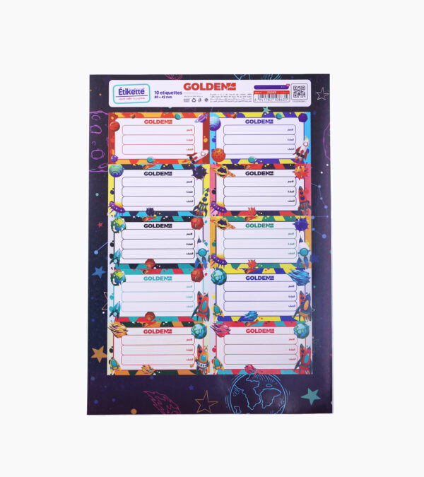 Embarquez vos fournitures dans une aventure cosmique avec les étiquettes scolaires autocollantes Espace & Fusées – GOLDEN SBM (Ref. 25069).