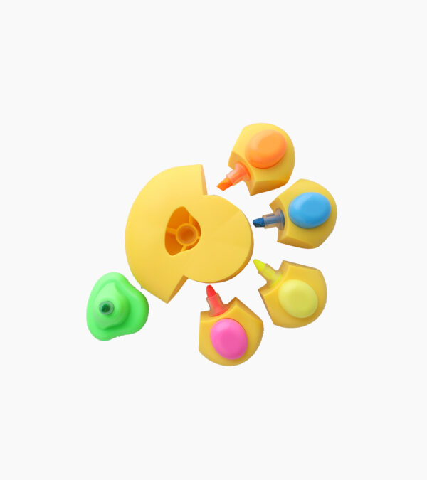 • 5 surligneurs en 1 : jaune, vert, bleu, rose, orange.